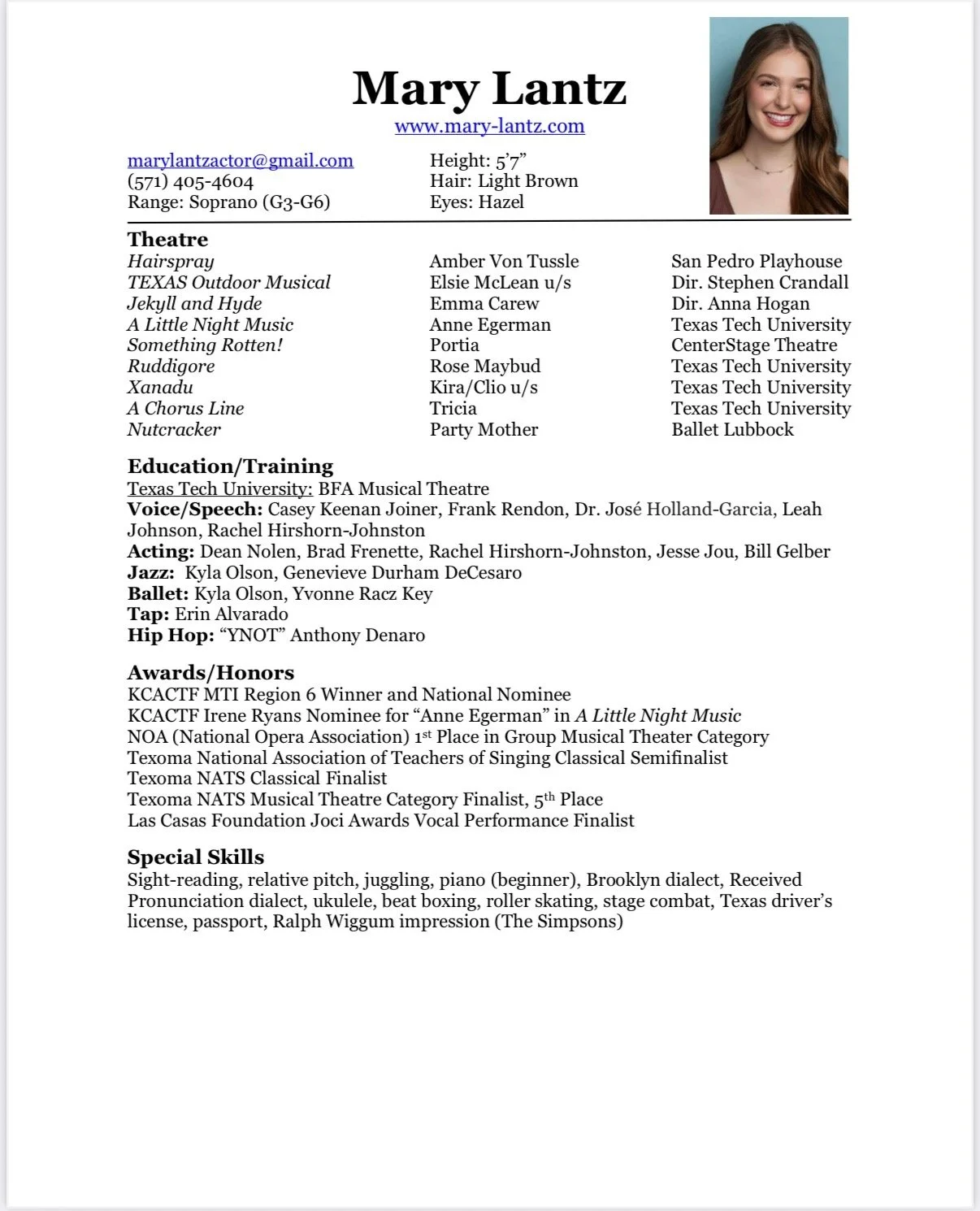 Mary Lantz is from San Antonio, Texas, and caught the musical theatre bug her sophomore year of high school.